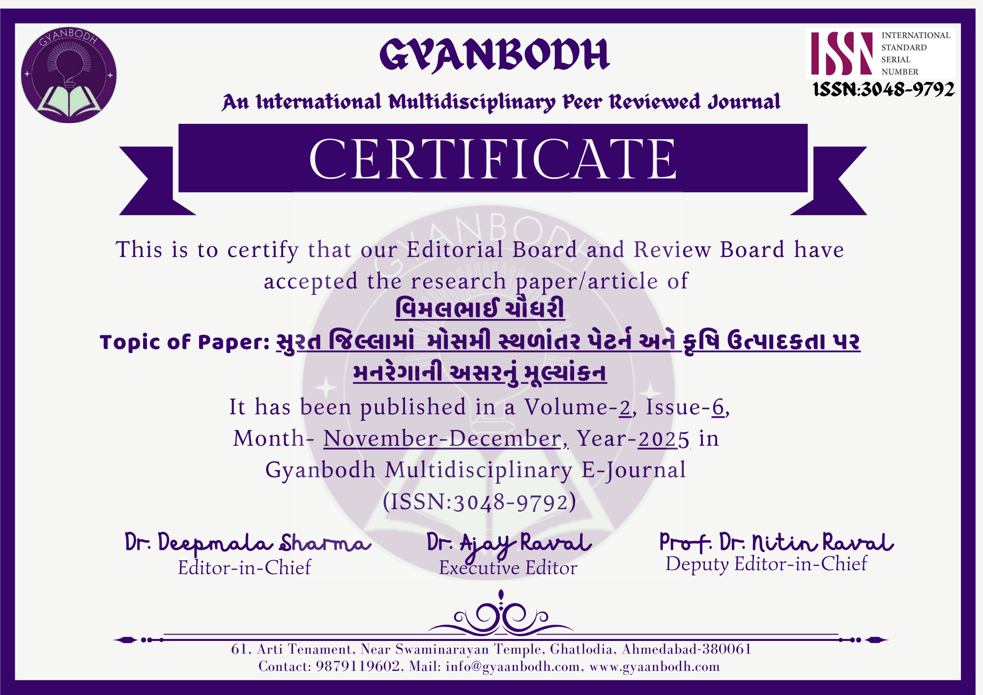 સુરત જિલ્લામાં મોસમી સ્થળાંતર પેટર્ન અને કૃષિ ઉત્પાદકતા પર મનરેગાની અસરનું મૂલ્યાંકન |
