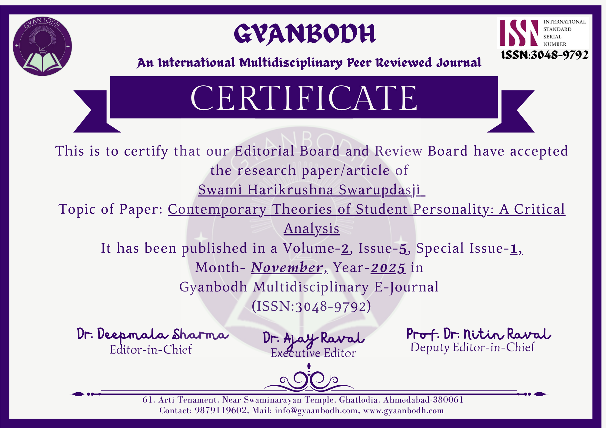 Swami Harikrushna Swarupdasji & Prof. Dr. Gunjan Shah |