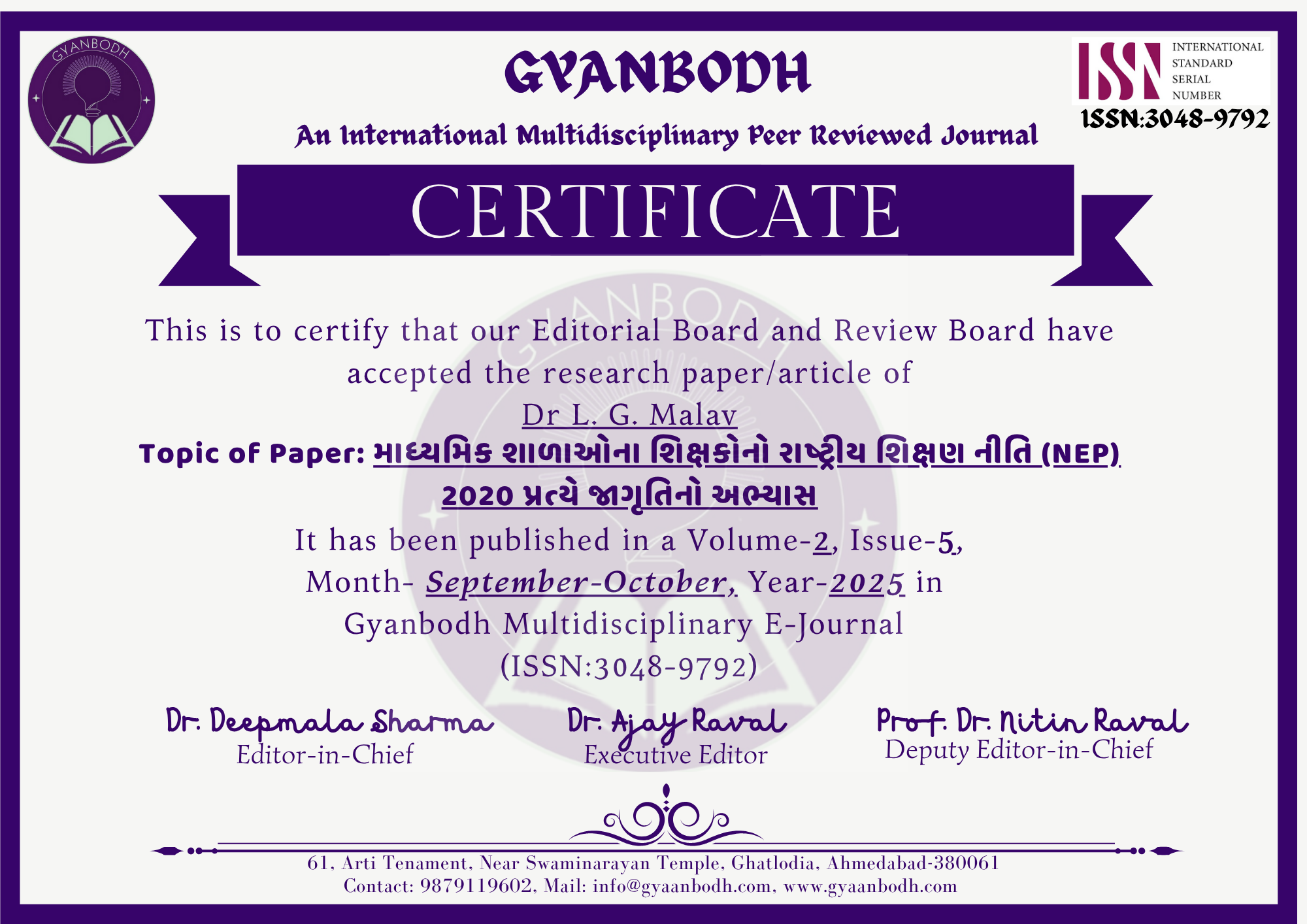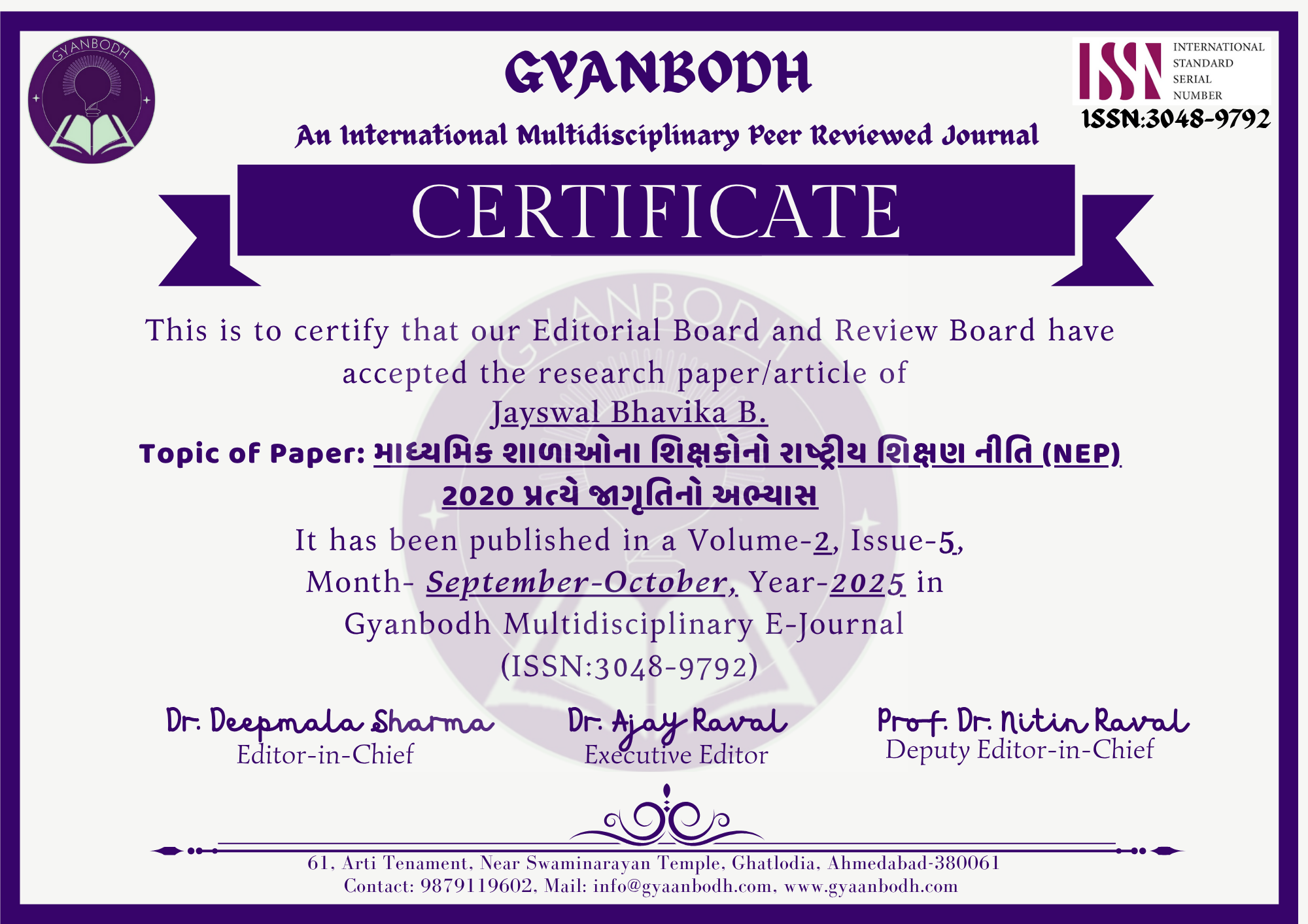માધ્યમિક શાળાઓના શિક્ષકોનો રાષ્ટ્રીય શિક્ષણ નીતિ (NEP) 2020 પ્રત્યે જાગૃતિનો અભ્યાસ |