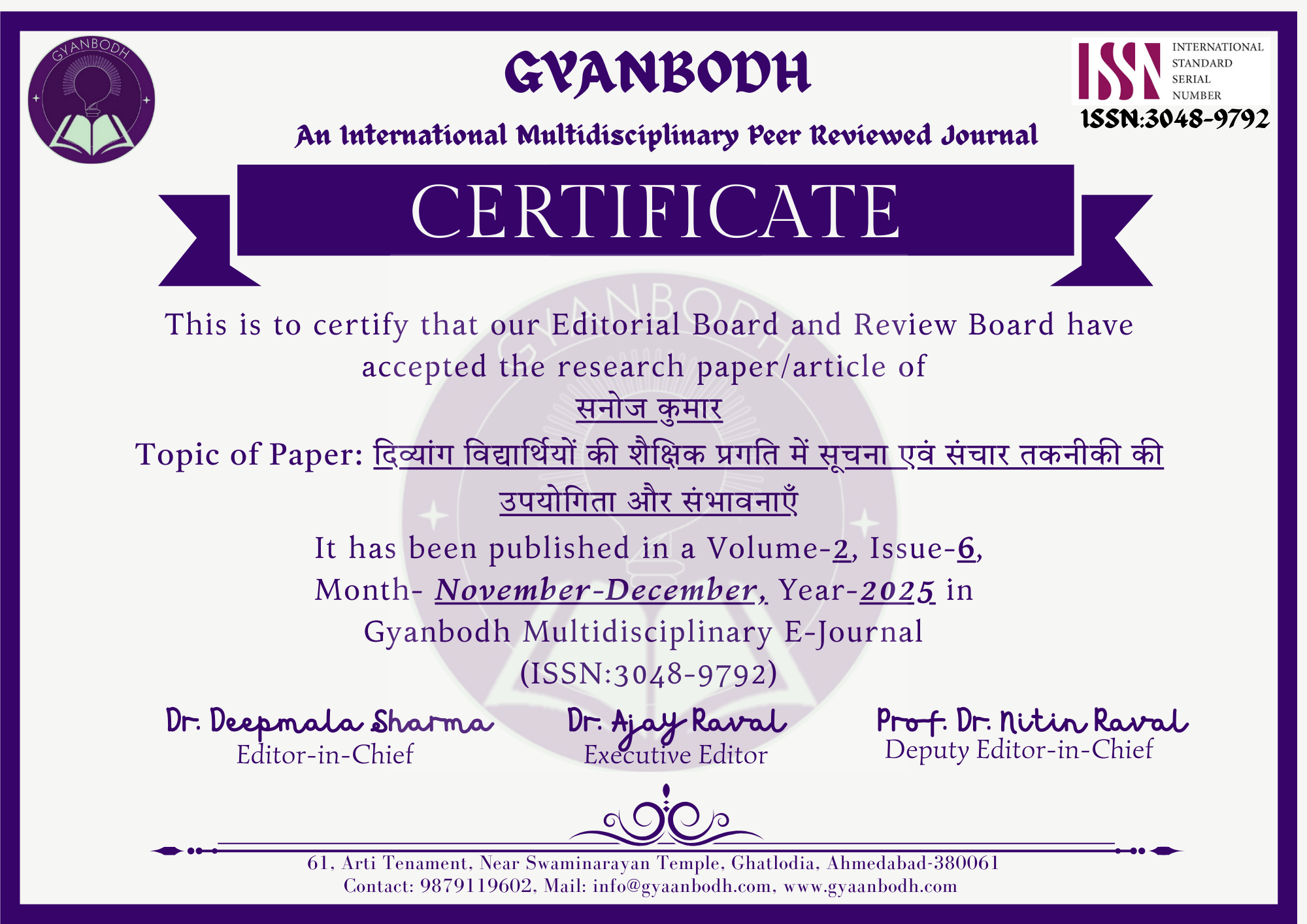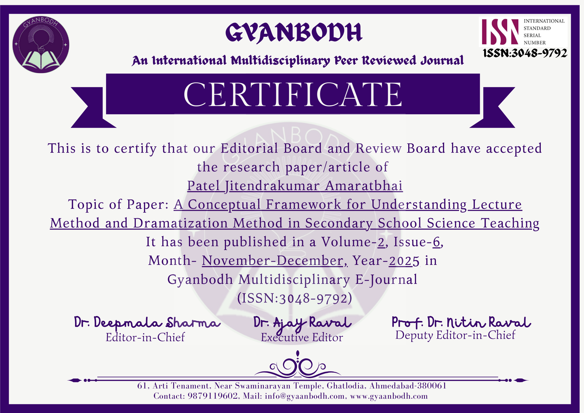 Patel Jitendrakumar Amaratbhai & Dr. Chhayaben Trivedi |